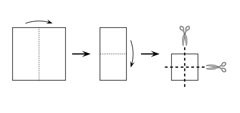 Tom faltet ein quadratisches Blatt Papier zweimal. Dann schneidet er es zweimal, so wie in der Abbildung. Wie viele Papierstücke erhält er? Tipp: Versuche es erst im Kopf zu lösen, dann probiere es aus.