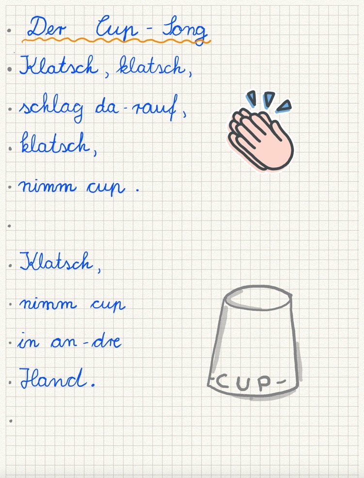 4.) Möchtest du dir den Spruch zum Cup-Song aufschreiben? Dann gestalte eine Seite in deinem Musikheft. Die Seite könnte so aussehen.